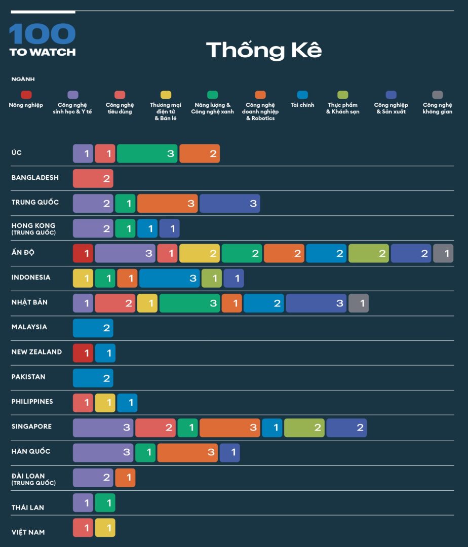 Danh sách 100 to Watch thường niên lần thứ năm của Forbes Asia đã mở ra cái nhìn toàn cảnh về thế giới sôi động của các doanh nghiệp nhỏ và startup đang bứt phá tại khu vực châu Á – Thái Bình Dương. Đây là một hệ sinh thái không ngừng thay đổi, nơi ngày càng nhiều công ty tập trung vào trí tuệ nhân tạo và công nghệ sâu (deep tech) để đổi mới và phát triển.