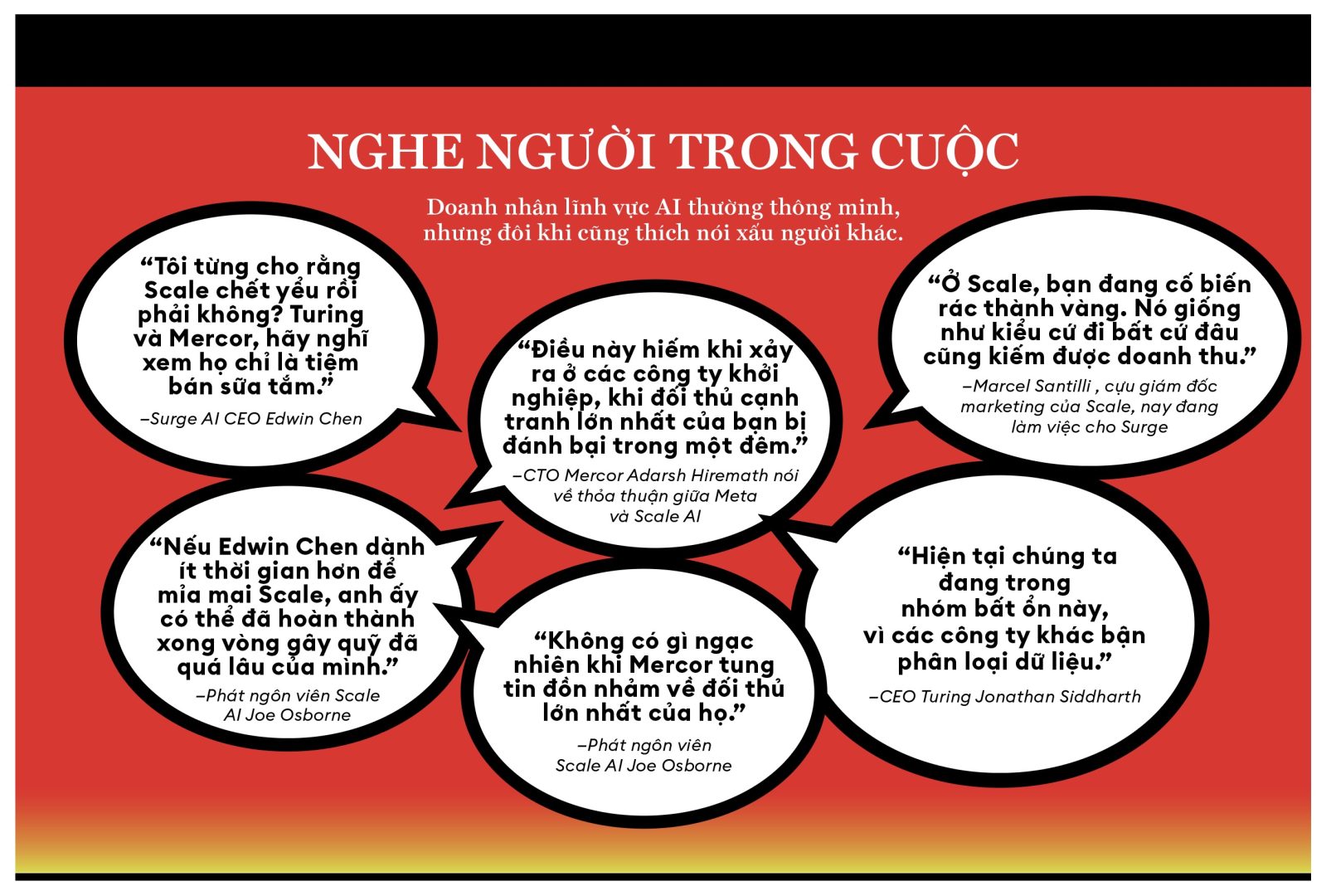 Câu hỏi đáng chú ý cho những công ty như Surge: Khi AI tiến bộ, sẽ đến lúc không cần phân loại dữ liệu bằng con người? Mô hình như Llama 4 của Meta, phát hành tháng 4.2025, phụ thuộc rất nhiều vào AI để tạo và phân loại dữ liệu. Surge sử dụng một biến thể gọi là “con người trong vòng lặp” cho phương pháp trên, trong đó AI tạo ra dữ liệu và phân loại, nhưng hiệu suất bị chỉ trích. CEO Chen tin rằng, người thật rất quan trọng. Khi con người và AI làm việc cùng nhau, hiệu suất sẽ vượt trội. Cả khi con người tham gia một cách gián tiếp, nhấn mạnh hơn vào máy móc tự đào tạo, cũng ảnh hưởng tích cực tới lợi nhuận, bởi việc đào tạo sẽ rẻ hơn. Một vấn đề khác của Surge: Cơn sóng thần vốn đầu tư đang tràn ngập đối thủ. Có tiền, họ không phải lo lắng về lợi nhuận ít nhất trong ngắn hạn, gây áp lực lên biên lợi nhuận toàn ngành. Hai khách hàng quan trọng của Surge đã không còn hợp tác. Phát ngôn viên của OpenAI xác nhận, họ không làm việc với Surge nữa, trong khi Mercor và Invisible đều tuyên bố OpenAI là khách hàng. Cohere – phòng thí nghiệm AI từng là một trong những khách đầu tiên của Surge, về cơ bản đã chuyển hoạt động phân loại dữ liệu sang cho nội bộ. Nhiều khách hàng dù vẫn làm việc với Surge nhưng cũng hợp tác thêm với bên thứ ba. Ví dụ Meta đã chi hàng chục tỷ USD để mua lại gần một nửa cổ phần Scale AI.