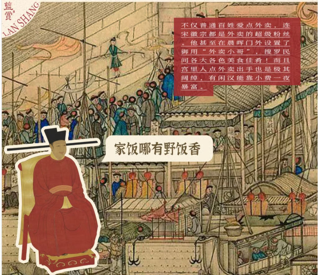 “Những người nhàn rỗi” thường lai vãng bên ngoài quán xá tửu lâu chính là tiền thân của đội ngũ tài xế giao hàng thời nay; lại có những người đặt đồ ăn được mang tới bằng kiệu.