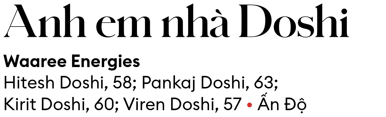 Bốn anh em, sở hữu tổng cộng 64% cổ phần Waaree, đã lọt danh sách 100 người giàu nhất Ấn Độ năm nay, sau khi đưa công ty niêm yết trên sàn chứng khoán năm 2024. Họ dự định hỗ trợ các lĩnh vực như giáo dục, chăm sóc sức khỏe và phát triển cộng đồng. Bốn người cũng đặt mục tiêu xây trường học và ký túc xá khắp Ấn Độ. Doanh nhân Doshi nói vào tháng 10.2025: “Bằng cách đầu tư vào những lĩnh vực thiết yếu này, chúng tôi trao quyền cho cá nhân và tạo cảm hứng thúc đẩy thay đổi tích cực lâu dài. Cùng nhau chúng ta có thể xây dựng tương lai công bằng và tươi sáng hơn.”