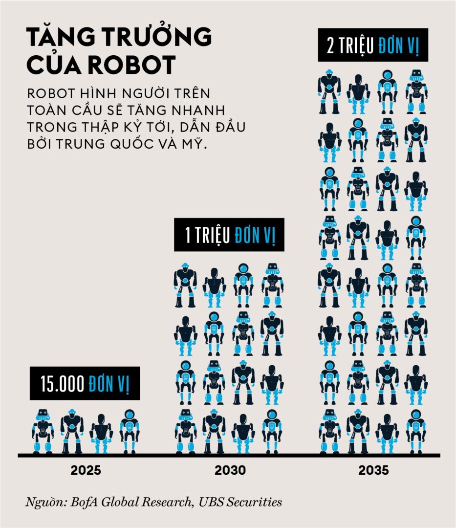 Mục tiêu trên có vẻ khiêm tốn, nhưng ông Xu muốn nhìn bức tranh toàn cảnh. Thế giới có thể sẽ đạt 2 triệu robot hình người vào cuối năm 2035, với 15.000 cá thể xuất xưởng năm 2025. Theo nhà phân tích Phyllis Wang từ UBS Securities có trụ sở tại Thượng Hải, con số này dự kiến tăng vọt lên 300 triệu năm 2050, đưa tổng giá trị thị trường robot bao gồm cả linh kiện và phần mềm, lên tới 1,7 ngàn tỷ USD.