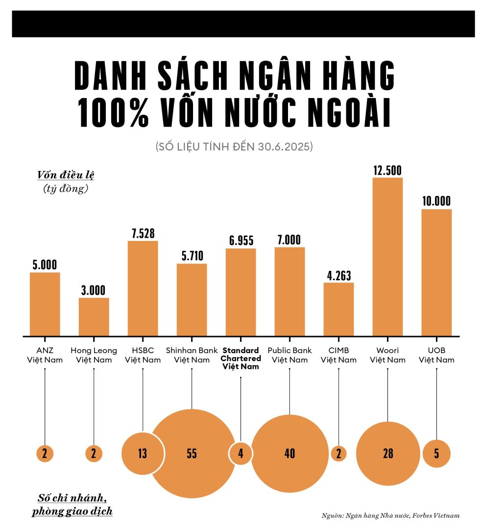 Hoạt động liên tục từ năm 1904 đến 1974 rồi rời đi và trở lại vào năm 1990, đến năm 2009, Standard Chartered Việt Nam chính thức trở thành ngân hàng 100% vốn nước ngoài. Theo báo cáo của Ngân hàng Nhà nước Việt Nam (SBV), tính đến 30.6.2025, Việt Nam có chín ngân hàng 100% vốn nước ngoài hoạt động. Trong đó, Standard Chartered Việt Nam nằm trong tốp 5 về vốn điều lệ với gần 6.955 tỷ đồng, xếp sau Woori Việt Nam (Hàn Quốc), UOB Việt Nam (Singapore), Public Bank Việt Nam (Malaysia), HSBC Việt Nam (Anh). Với 1.400 nhân sự, Standard Chartered Việt Nam hiện có bốn chi nhánh, phân bổ đều ở hai trung tâm kinh tế lớn là Hà Nội và TP HCM.