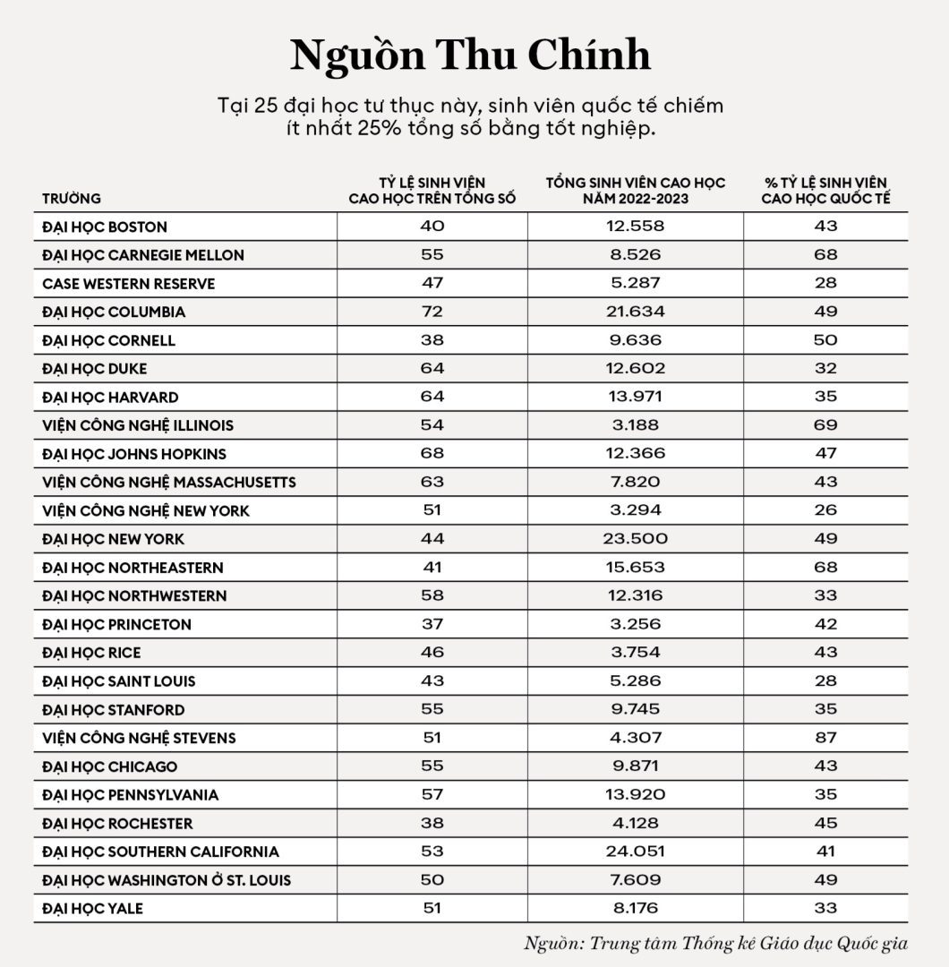 Đứng đầu danh sách là Đại học Columbia ở New York, với số sinh viên năm học 2022-2023 gồm 72% sau đại học trong đó 49% đến từ nước ngoài. Tháng 7.2025, Columbia ký thỏa thuận với chính quyền ông Trump, theo đó nhà trường sẽ trả 221 triệu USD cho chính phủ, cung cấp thêm thông tin về sinh viên không phải người Mỹ và giảm bớt sự phụ thuộc tài chính vào sinh viên quốc tế. Đổi lại, khoản trợ cấp liên bang 1,3 tỷ USD và một số nguồn khác sẽ được nối lại. Giới quan sát đánh giá, đây là “lựa chọn bắt buộc”.