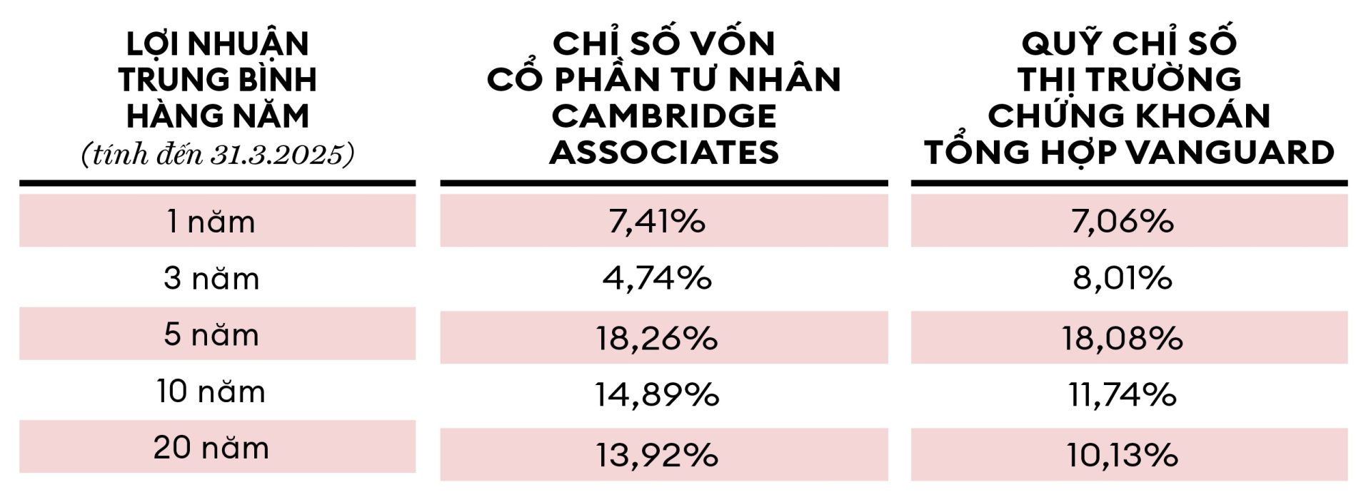 Vốn tư nhân vượt trội hơn thị trường chứng khoán đại chúng trong 20 năm qua, nhưng 3 năm gần đây, vốn này lại tụt hậu so với vốn cổ phần đại chúng, được đo bằng Quỹ chỉ số thị trường chứng khoán tổng hợp Vanguard có tổng tài sản 1,9 nghìn tỷ USD.