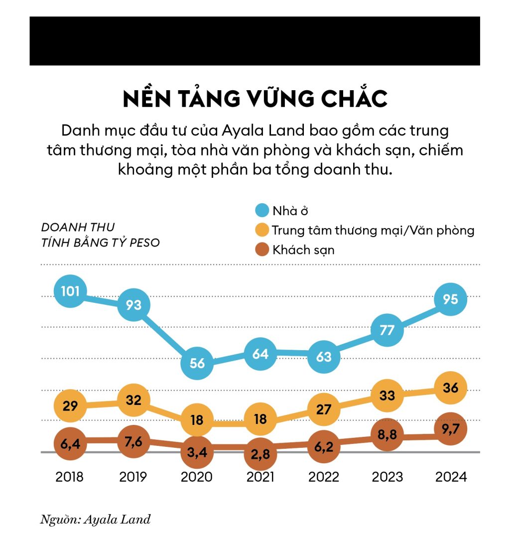 “Các trung tâm thương mại, văn phòng và khách sạn của chúng tôi không chỉ mang lại nguồn thu nhập ổn định, đều đặn mà còn bổ trợ cho tính năng động của mảng phát triển bất động sản,” bà Dy chia sẻ qua email. “Dưới sự dẫn dắt của Mariana, chúng tôi không chỉ đơn thuần cải tạo không gian, mà còn tái tạo nên những môi trường sống, phản chiếu nhu cầu ngày càng đổi thay của thế hệ mới,” bà Dy nhấn mạnh. Ayala Land không hề tụt lại phía sau. Năm 2024, doanh thu của tập đoàn đạt 181 tỷ peso – tăng một phần năm so với cùng kỳ năm trước. Tuy vậy, theo ông Benjamin Garcia, trưởng bộ phận nghiên cứu tại AP Securities ở Manila, việc chuẩn bị cho tương lai là ưu tiên hàng đầu, đặc biệt là giảm sự phụ thuộc vào doanh số bán nhà ở, vốn là nguồn thu lớn nhất hiện nay của công ty.