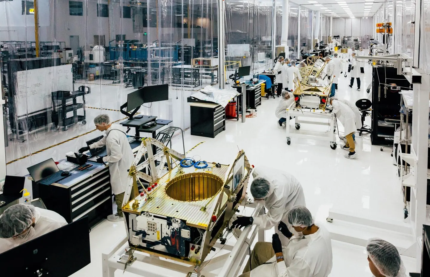 Phía sau màn hình giám sát, bên trong một phòng sạch được ngăn cách bởi tấm màn nhựa vinyl trong suốt, các kỹ thuật viên đội mũ trùm tóc đang miệt mài làm việc trên một chiếc vệ tinh Aries khác. Thiết bị này được đặt trên bệ có bánh lăn tại một trong sáu trạm thuộc dây chuyền lắp ráp của Apex. Cinnamon khẳng định đây chính là làn sóng của tương lai trong ngành công nghiệp vệ tinh, nơi mà từ trước đến nay, các nhà máy thường chỉ chế tạo đơn lẻ từng chiếc một. Ông dự kiến sẽ sản xuất hàng chục vệ tinh mỗi tháng tại nhà máy này.