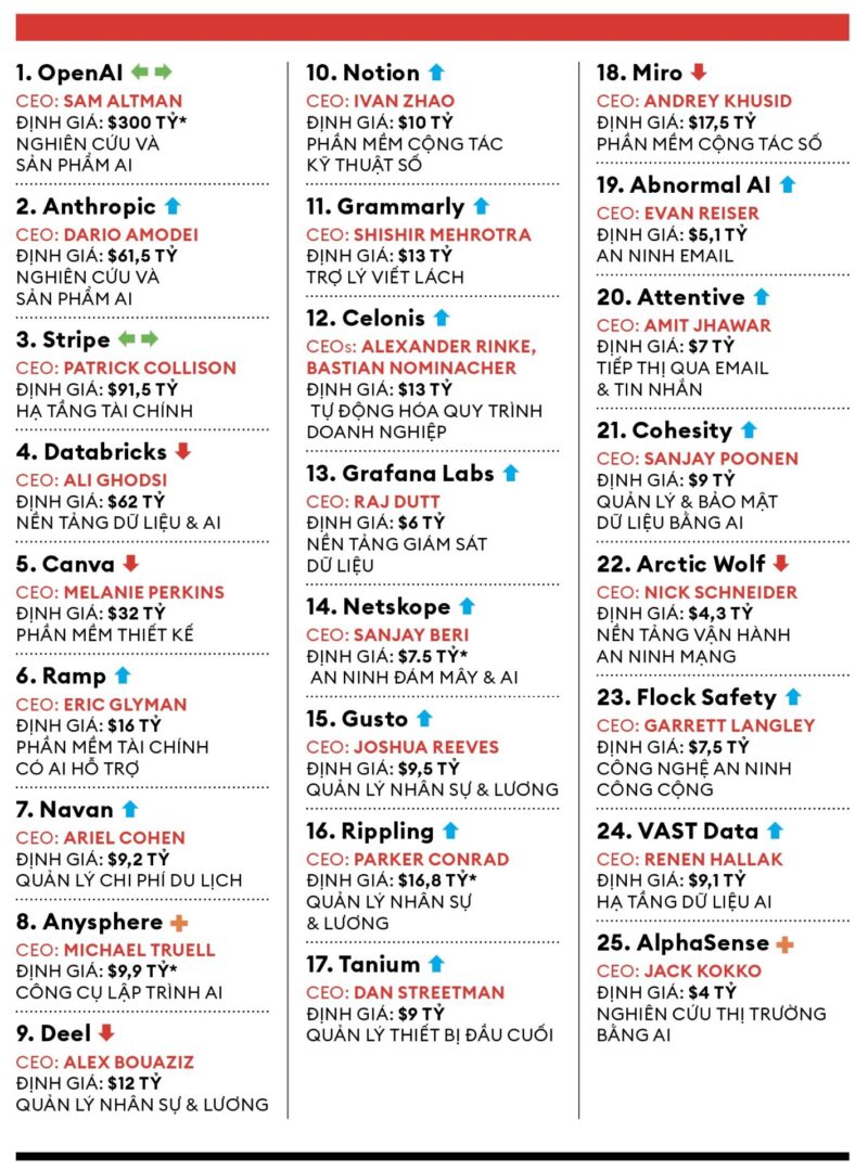 Bảng xếp hạng thường niên lần thứ mười về các công ty hàng đầu thế giới trong lĩnh vực điện toán đám mây tư nhân, được Forbes thực hiện cùng Bessemer Venture Partners và Salesforce Ventures, cho thấy trí tuệ nhân tạo (AI) tiếp tục chiếm ưu thế tuyệt đối. OpenAI giữ vững vị trí đầu bảng, trong khi đối thủ Anthropic vươn lên sát nút từ vị trí thứ năm. Tân binh Anysphere, nhà phát triển công cụ lập trình Cursor, đứng ở vị trí thứ tám. Ramp, một công ty fintech mới gia nhập danh sách năm ngoái, cũng tăng hạng đáng kể, vượt lên vị trí thứ sáu từ vị trí 37 trước đó. Danh sách 25 công ty hàng đầu được trình bày dưới đây.