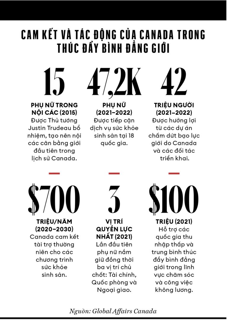 Canada không tự nhận mình có lời giải cho mọi vấn đề, nhưng chúng tôi đã và đang đi những bước tiến vững chắc, có chủ đích. Kể từ năm 2018, phụ nữ đã đảm nhiệm hơn một nửa số vị trí đại sứ và tổng lãnh sự của Canada. Dấu mốc ấy là minh chứng rõ nét cho cam kết mạnh mẽ của “xứ sở lá phong” trong việc thúc đẩy bình đẳng giới và xây dựng một đội ngũ ngoại giao phản chiếu đúng bản sắc đa dạng, cởi mở của xã hội nước này.